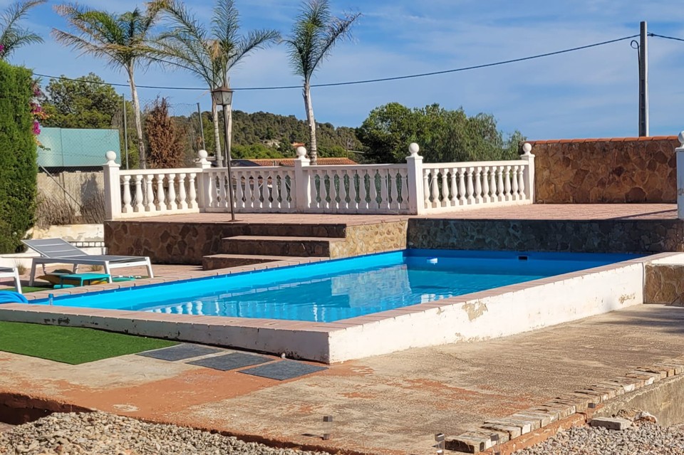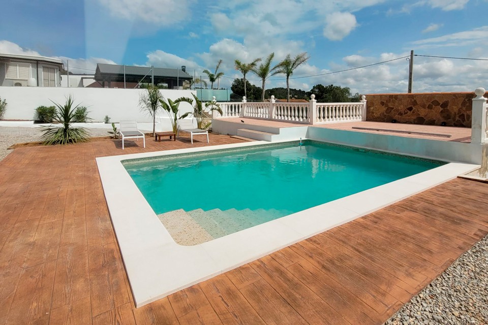 Rehabilitación integral de piscina en Olocau, incluyendo cambio de piedra de coronación, renovación completa del sistema hidráulico, restauración de la escalera de acceso y nuevo revestimiento para mejorar estética y funcionalidad.